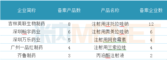 表2:注射劑一致性評(píng)價(jià)參比制劑備案企業(yè)及產(chǎn)品TOP5