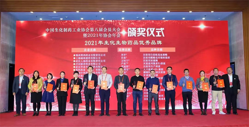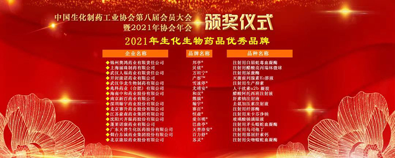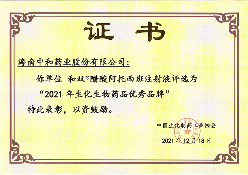 2021年12月18日,在北京召開(kāi)的“中國(guó)生化制藥工業(yè)協(xié)會(huì)第八屆會(huì)員大會(huì)暨2021年協(xié)會(huì)年會(huì)”上,海南中和藥業(yè)產(chǎn)品和雙?醋酸阿托西班注射液榮獲“2021年生化生物藥品優(yōu)秀品牌”稱(chēng)號(hào)。