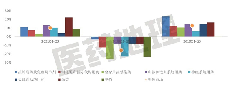 圖2樣本醫(yī)院市場(chǎng)TOP8治療類別近年增長(zhǎng)趨勢(shì)(2019Q1-Q3,2020Q1-Q3,2021Q1-Q3)