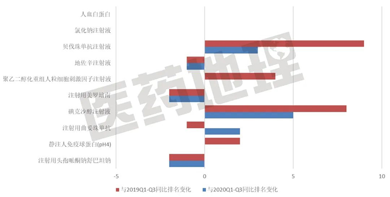 基于PDB國(guó)內(nèi)樣本醫(yī)院市場(chǎng)數(shù)據(jù),2021年前三季度最為暢銷的10個(gè)產(chǎn)品如圖所示,全部都是注射給藥。相較于2020年和2019年同期,人血白蛋白和氯化鈉注射液的地位極其穩(wěn)定;聚乙二醇化重組人粒細(xì)胞刺激因子注射液和靜注人免疫球蛋白(pH4)的排名相較于2020年同期無(wú)任何變化;地佐辛注射液、注射用美羅培南和注射用頭孢哌酮鈉舒巴坦鈉的排名下滑明顯;排名上升比較快的是貝伐珠單抗注射液和碘克沙醇注射液。