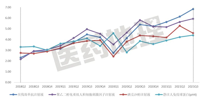 具體來(lái)看,近三年間排名只升不降的有4個(gè)產(chǎn)品,競(jìng)爭(zhēng)非常激烈。在2018年二季度時(shí),4個(gè)產(chǎn)品的排名依次是靜注人免疫球蛋白、碘克沙醇、貝伐珠單抗和粒細(xì)胞刺激因子,季度銷售額最大差距為1.14億元;但到了2021年三季度,排名已經(jīng)變成了貝伐珠單抗、粒細(xì)胞刺激因子、碘克沙醇和靜注人免疫球蛋白,季度銷售額最大差距擴(kuò)大至2.44億元。未來(lái)或有新產(chǎn)品入局。