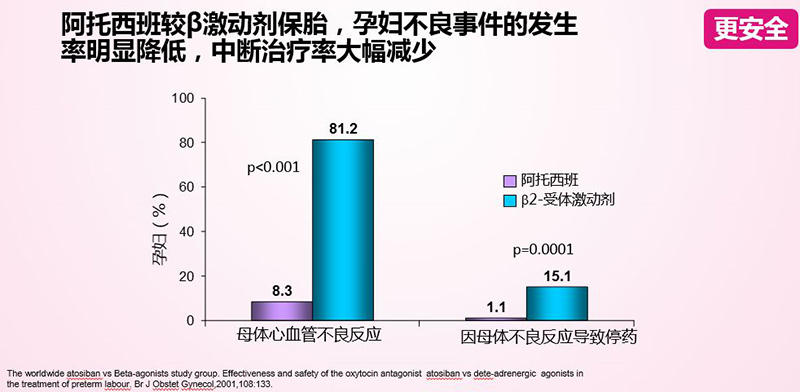 2.阿托西班與β激動(dòng)劑保胎效果比較,孕婦心血管方面的不良事件的發(fā)生率明顯減少了9倍,中斷治療率大幅減少。