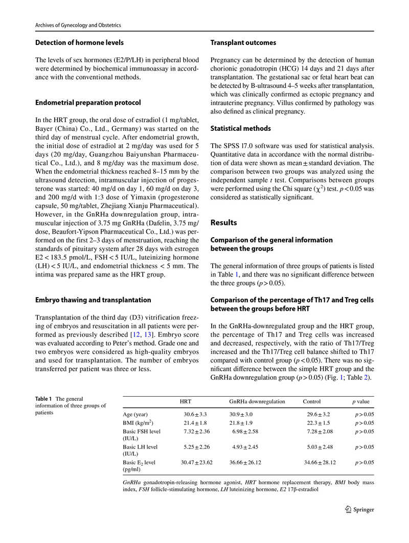 方法:研究了52例凍融胚胎的RIF患者(<40歲女性、≥3個且連續(xù)的移植周期、≥4個優(yōu)質(zhì)胚胎)。29例接受單純激素替代治療(HRT)的患者為移植組,其余23例HRT聯(lián)合GnRHa降調(diào)的為GnRHa降調(diào)組。另外,選擇正常妊娠早期組30例作為對照組。