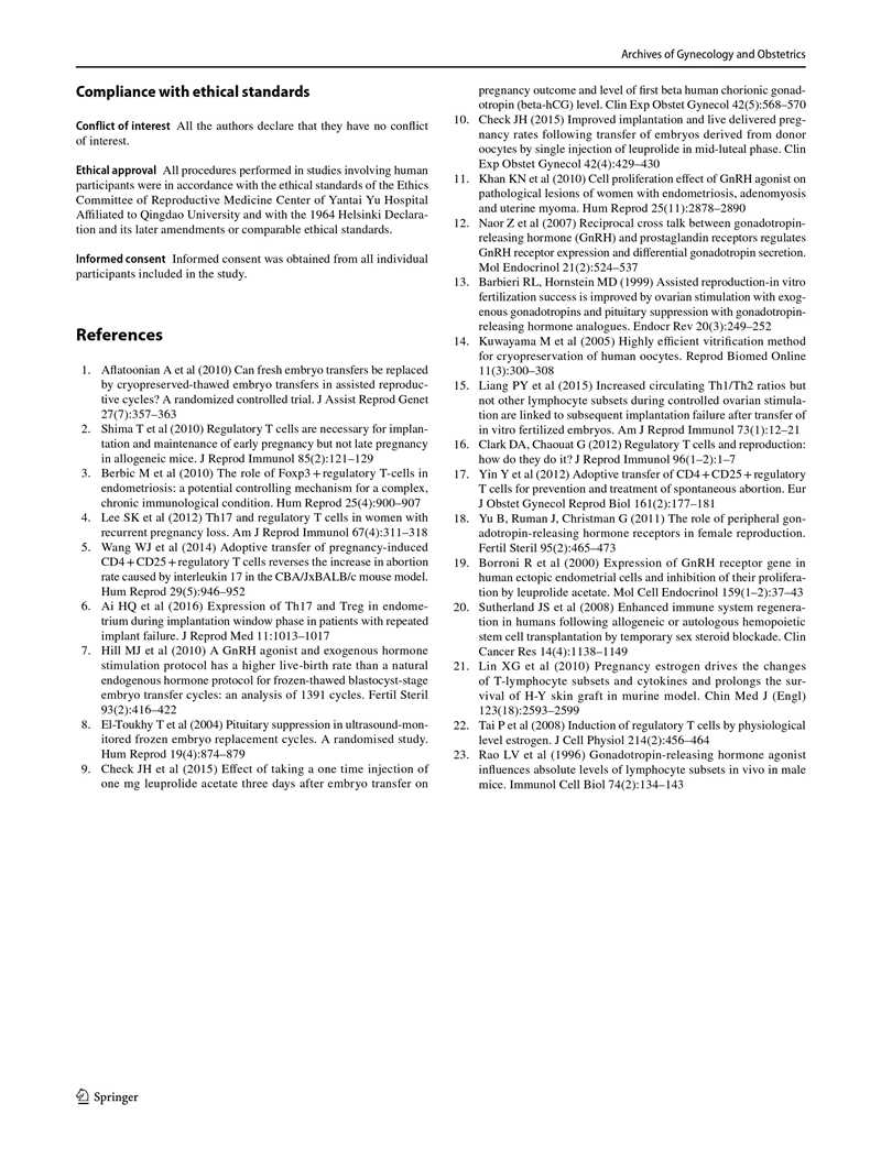 結(jié)果:HRT前,HRT組與對照組相比,CD4+淋巴細胞中的Th17和Treg細胞數(shù)量分別增加和減少,Th17 / Treg細胞比值升高(p<0.05)。在孕酮轉(zhuǎn)化當天,與HRT組相比,GnRHa降調(diào)組的Th17和Treg細胞百分比分別降低和升高,Th17 / Treg細胞比值顯著降低(p<0.05)。GnRHa降調(diào)組的雌激素(E2)水平略高于HRT組,兩組間差異無統(tǒng)計學意義(p> 0.05)。此外,HRT組和GnRHa降調(diào)組在移植后第14天和第21天的絨毛膜促性腺激素水平?jīng)]有顯著差異(p>0.05)。