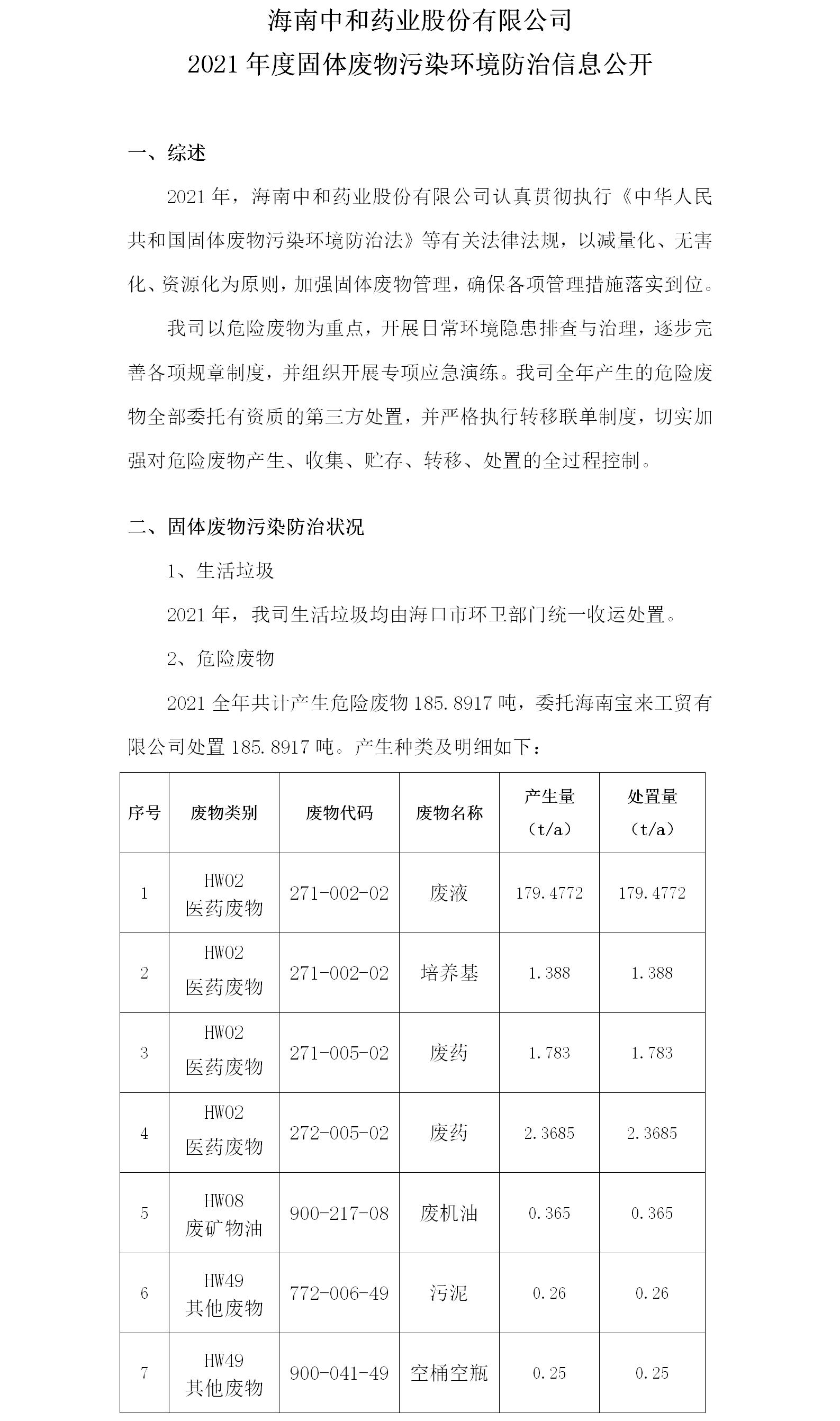 海南中和藥業(yè)股份有限公司2021年度固體廢物