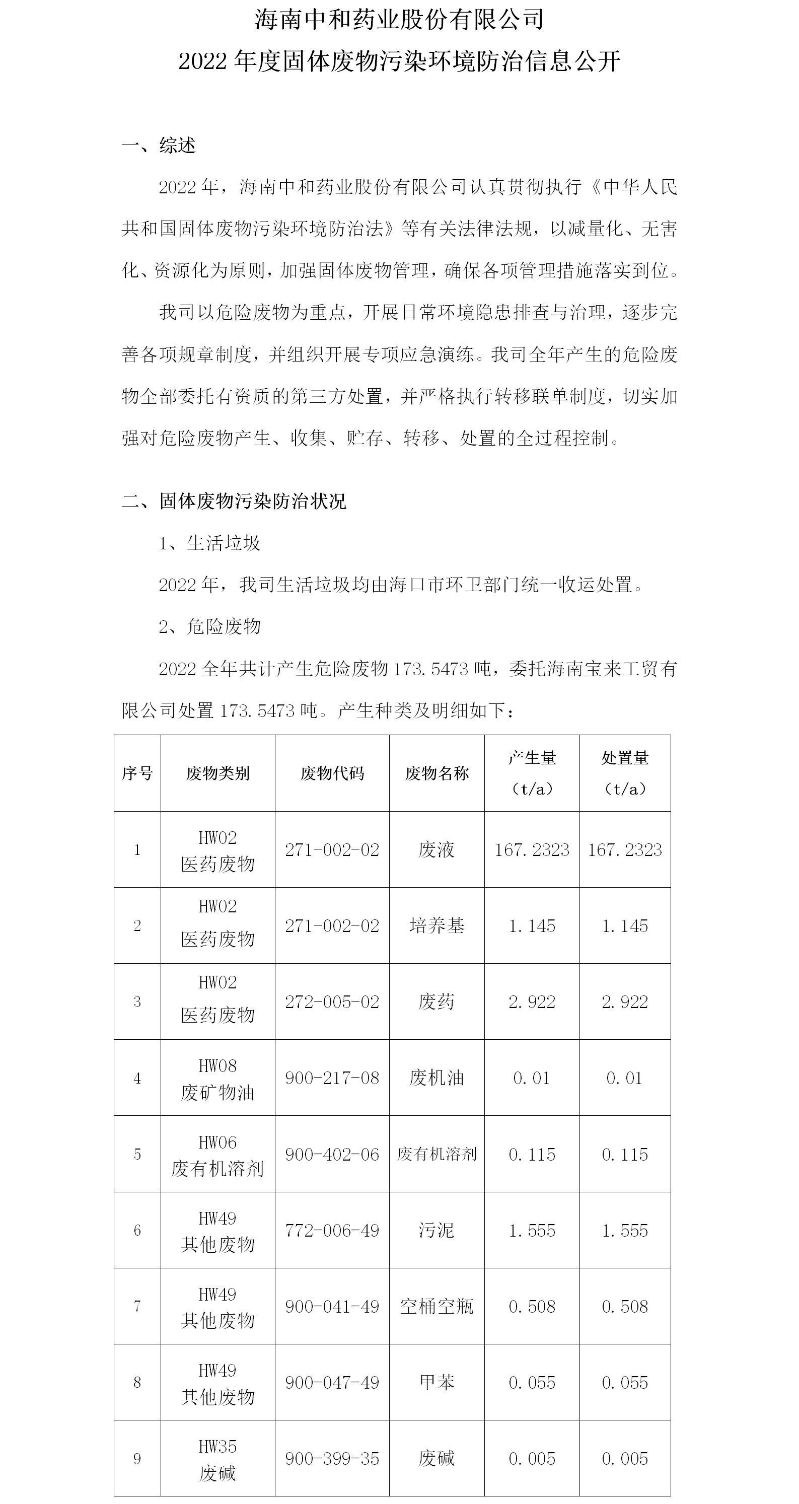 海南中和藥業(yè)股份有限公司2022年度固體廢物