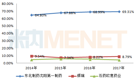 從2017年的數(shù)據(jù)看,東北制藥以69.31%的市場(chǎng)份額位居首位,原研廠家輝瑞以8.79%的比例緊接其后。從近幾年各大品牌的市場(chǎng)份額變化看,東北制藥基本呈現(xiàn)穩(wěn)定增長(zhǎng)的態(tài)勢(shì),輝瑞的市場(chǎng)份額則有所波動(dòng)。