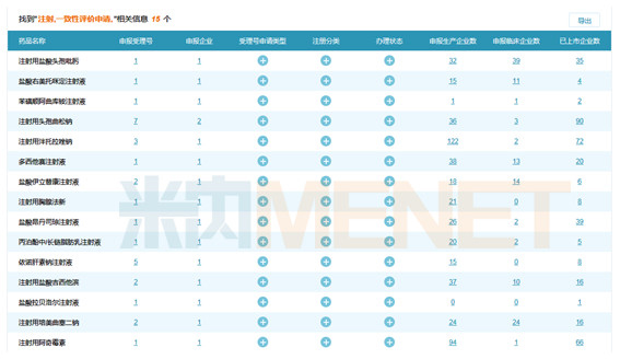 據(jù)米內(nèi)網(wǎng)MED中國(guó)藥品審評(píng)數(shù)據(jù)庫(kù)2.0數(shù)據(jù),截至目前,除了已經(jīng)通過一致性評(píng)價(jià)的注射用阿奇霉素,國(guó)家藥監(jiān)局還接收到化藥注射劑一致性評(píng)價(jià)申報(bào)29個(gè),涉及14個(gè)品種、10家企業(yè)。
