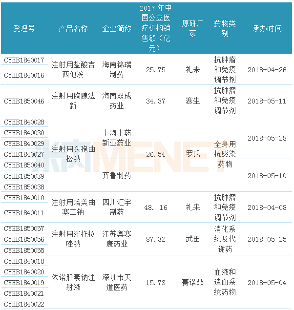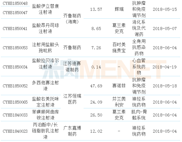 從治療類別看,14個(gè)品種中有5個(gè)為抗腫瘤和免疫調(diào)節(jié)劑,可見抗腫瘤領(lǐng)域是藥企們申報(bào)的重點(diǎn),消化系統(tǒng)及代謝、神經(jīng)系統(tǒng)藥物、全身抗感染藥物均有2個(gè)產(chǎn)品;從產(chǎn)品的申報(bào)廠家看,齊魯制藥及子公司申報(bào)的產(chǎn)品最多;從申報(bào)的產(chǎn)品看,除了注射用頭孢曲松鈉有2家企業(yè)同時(shí)申報(bào)外,其他品種均只有1家企業(yè)申報(bào);從產(chǎn)品的銷售額看,2017年在公立醫(yī)療機(jī)構(gòu)終端銷售額超過10億元的產(chǎn)品有11個(gè)(超過20億元的有8個(gè)),其中注射用泮托拉唑鈉接近90億元,注射用培美曲塞二鈉及多西他賽注射液接近50億元。