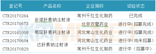 截至目前,一致性評(píng)價(jià)中準(zhǔn)備開展/已開展/已完成BE試驗(yàn)的注射劑有5個(gè)登記號(hào),涉及企業(yè)3家,品種3個(gè)。從進(jìn)行試驗(yàn)的企業(yè)看,常州千紅生化藥業(yè)、河北常山生化藥業(yè)均有2個(gè)產(chǎn)品處于試驗(yàn)階段;從試驗(yàn)的產(chǎn)品看,有2家藥企進(jìn)行BE試驗(yàn)的依諾肝素鈉注射液,深圳市天道醫(yī)藥已搶先一步,其產(chǎn)品已經(jīng)處于申報(bào)一致性評(píng)價(jià)的隊(duì)列。