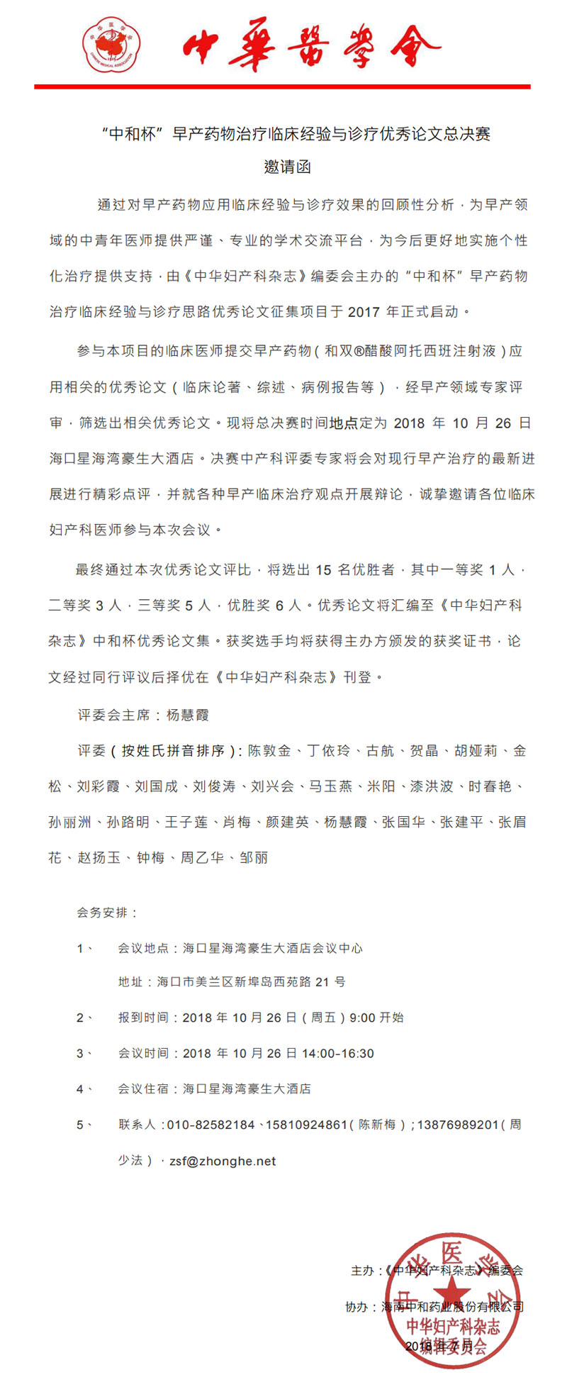 參與本項目的臨床醫(yī)師提交早產(chǎn)藥物(和雙?醋酸阿托西班注射液)應(yīng)用相關(guān)的優(yōu)秀論文(臨床論著、綜述、病例報告等),經(jīng)早產(chǎn)領(lǐng)域?qū)<以u審,篩選出相關(guān)優(yōu)秀論文?,F(xiàn)將總決賽時間地點定為 2018 年 10 月 26 日海口星海灣豪生大酒店。決賽中產(chǎn)科評委專家將會對現(xiàn)行早產(chǎn)治療的最新進(jìn)展進(jìn)行精彩點評,并就各種早產(chǎn)臨床治療觀點開展辯論,誠摯邀請各位臨床婦產(chǎn)科醫(yī)師參與本次會議。
