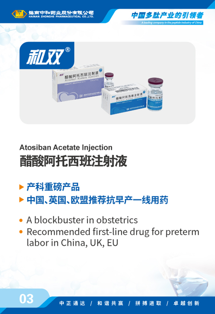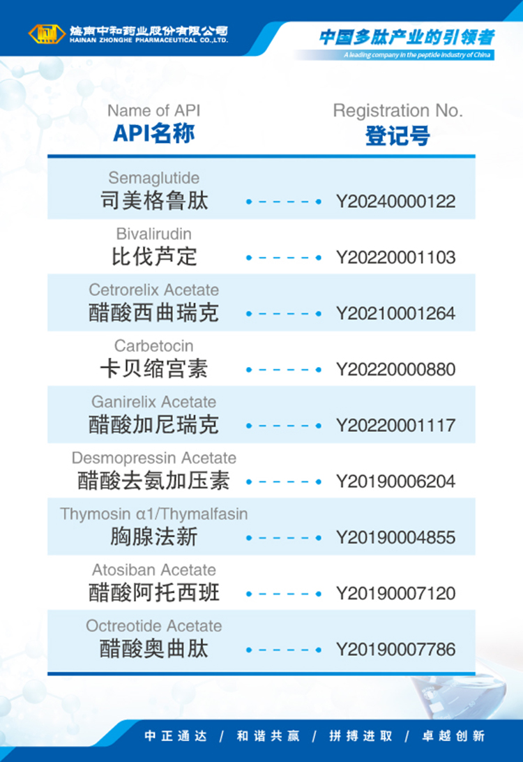 海南中和藥業(yè)股份有限公司(以下簡稱中和藥業(yè))成立于1995年4月17日,為我國最早專門從事化學合成多肽藥物的研究和實現(xiàn)產(chǎn)業(yè)化的國家高新技術企業(yè),中國國內(nèi)第一個化學合成多肽類新藥“注射用胸腺五肽”就由中和藥業(yè)自行研發(fā)上市,填補了中國多肽產(chǎn)業(yè)的空白。歷經(jīng)近30年的發(fā)展,公司產(chǎn)品已涵蓋免疫、腫瘤、肝病、心血管、內(nèi)分泌、婦科圍產(chǎn)等多個治療領域,并擁有多肽原料藥、化學原料藥及小容量注射劑(包括預灌封、卡式瓶)、凍干粉針劑、片劑、膠囊劑等多種劑型的生產(chǎn)能力,產(chǎn)品已成功出口韓國、烏茲別克斯坦等多個國家和地區(qū)。
