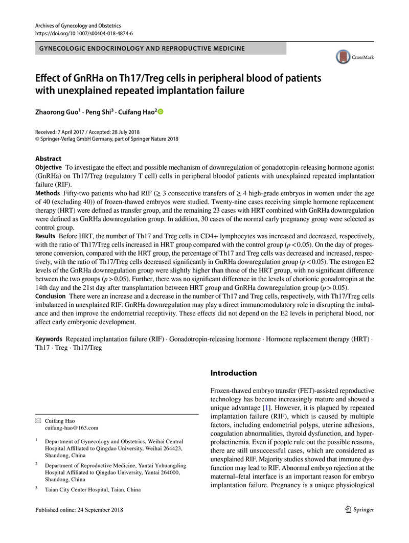 目的:探討促性腺激素釋放激素激動劑(GnRHa)降調(diào)對原因不明的反復移植失敗(RIF)患者外周血Th17 / Treg(調(diào)節(jié)性T細胞)細胞的影響及其可能機制。