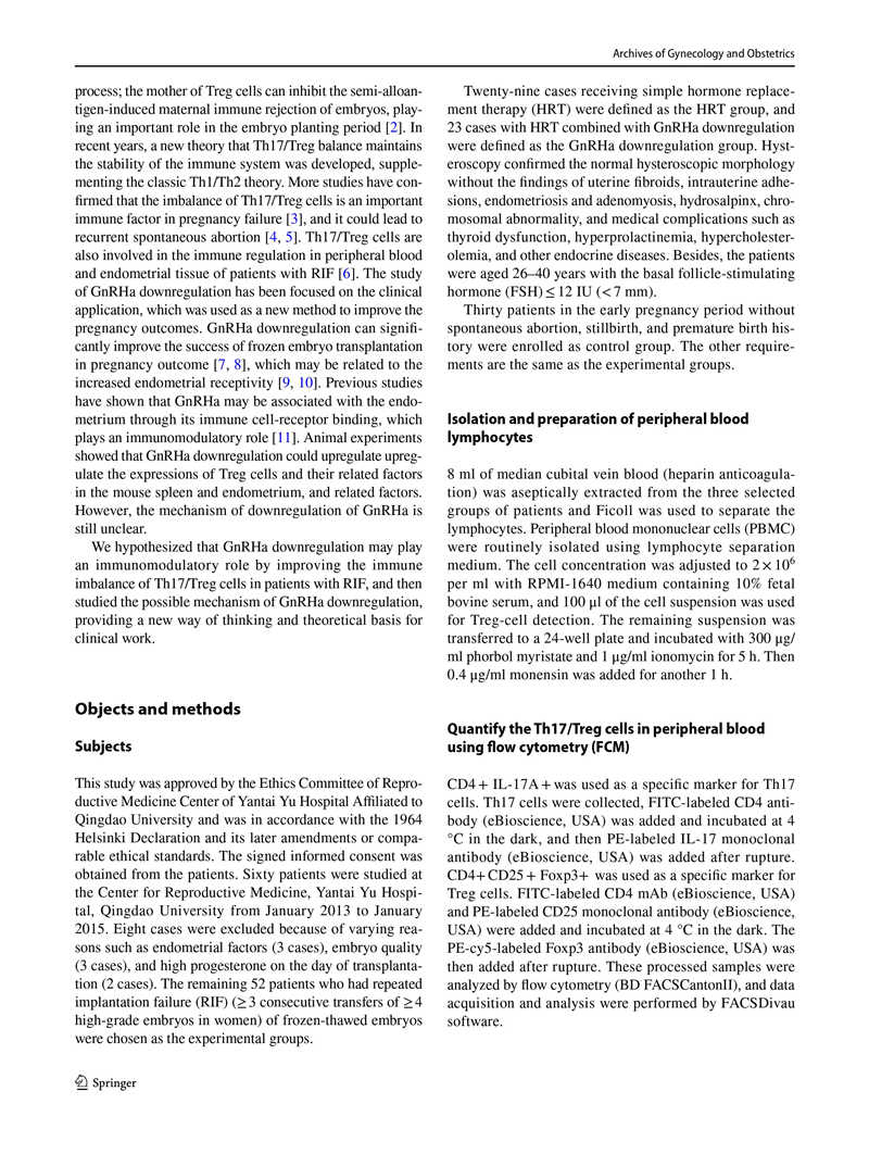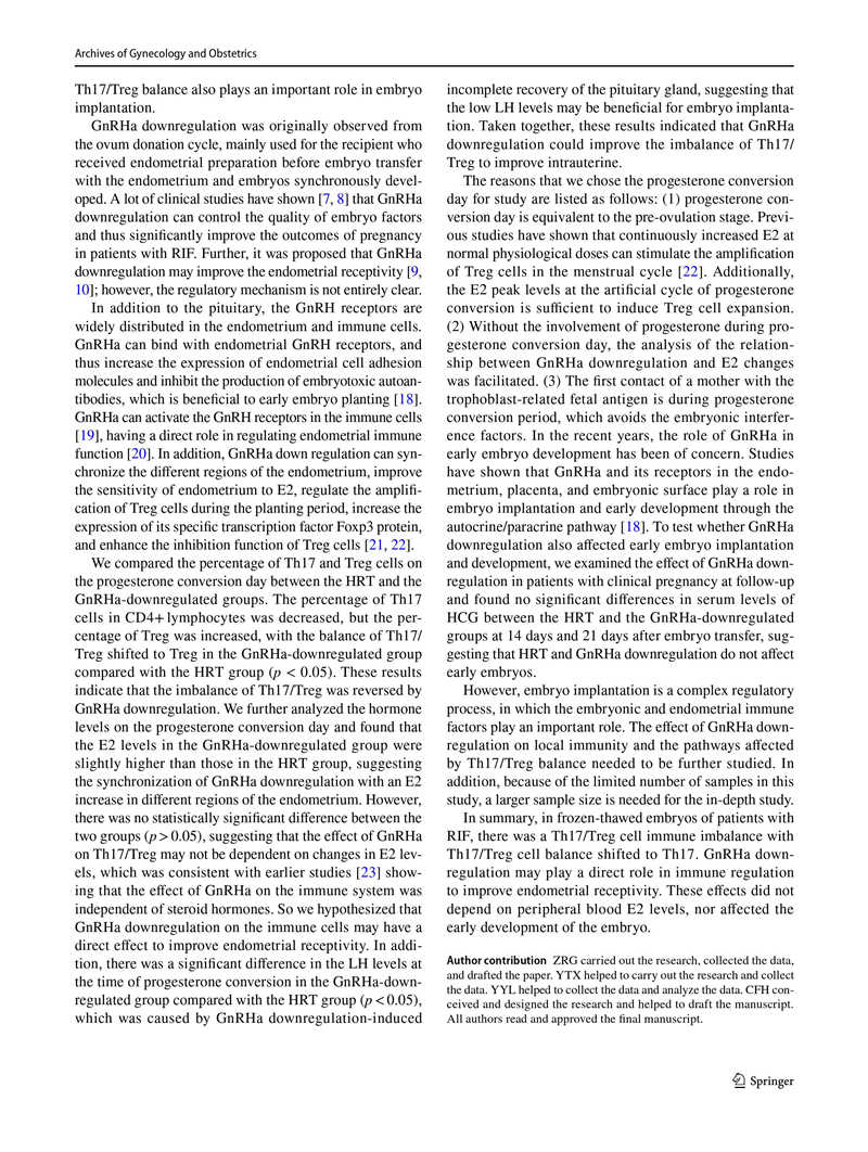 結(jié)論:在不明原因的RIF患者中,Th17和Treg細胞數(shù)量分別增加和減少,Th17 / Treg細胞比值失衡。GnRHa降調(diào)可能通過阻斷Th17/Treg細胞比值失衡發(fā)揮免疫調(diào)節(jié)作用從而提高子宮內(nèi)膜容受性。這些作用不依賴于外周血中的E2水平,也不影響早期胚胎發(fā)育。