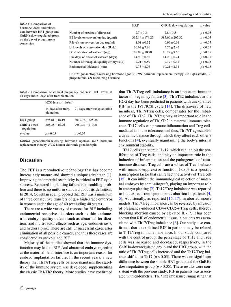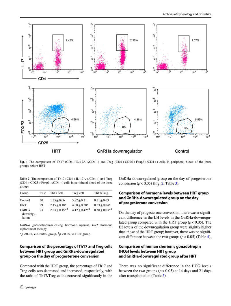 結(jié)果:HRT前,HRT組與對照組相比,CD4+淋巴細胞中的Th17和Treg細胞數(shù)量分別增加和減少,Th17 / Treg細胞比值升高(p<0.05)。在孕酮轉(zhuǎn)化當天,與HRT組相比,GnRHa降調(diào)組的Th17和Treg細胞百分比分別降低和升高,Th17 / Treg細胞比值顯著降低(p<0.05)。GnRHa降調(diào)組的雌激素(E2)水平略高于HRT組,兩組間差異無統(tǒng)計學意義(p> 0.05)。此外,HRT組和GnRHa降調(diào)組在移植后第14天和第21天的絨毛膜促性腺激素水平?jīng)]有顯著差異(p>0.05)。